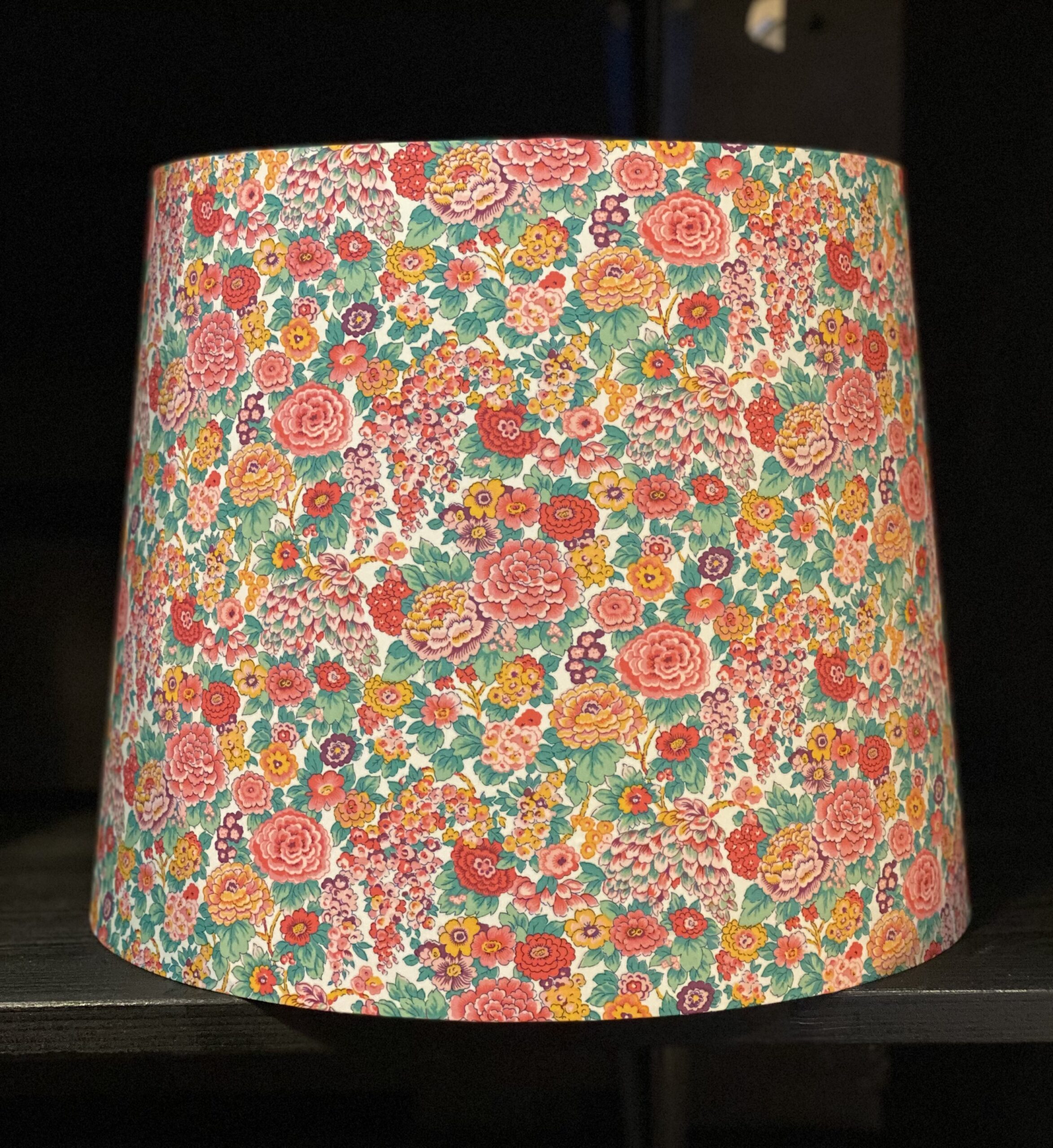 Blomsterhav i pink toner fra fantastiske Liberty. Super romantisk empireskærm. Kan også leveres med låg for en merpris a’ 130 kr.